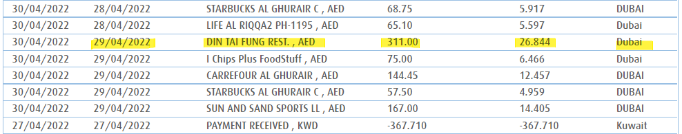 이렇게 주문을 하고 얼마 나왔는지 카드 명세서를 다시 살펴보니 총 311 AED / 쿠웨이트 디나르로는 26.844 KD가 나왔습니다. 원화로는 약 10.8 만원 정도입니다.