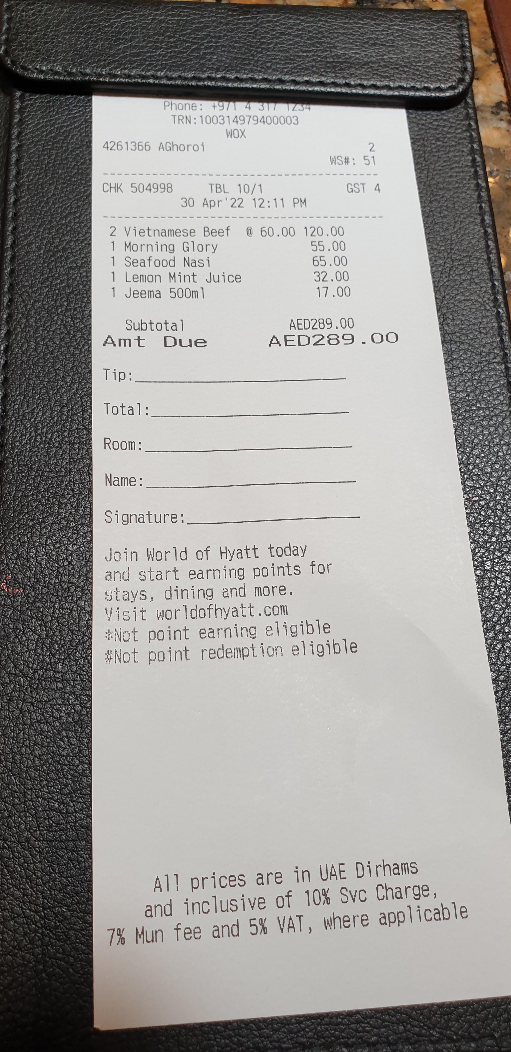 영수증을 받아보니 나온 금액은 총 289 디르함. 오늘 환율로 약 10 만원입니다. 디르함으로 낼 때는 몰랐는데 막상 원화로 적으니 먹은 것에 비해 금액이 비싸 보이네요.