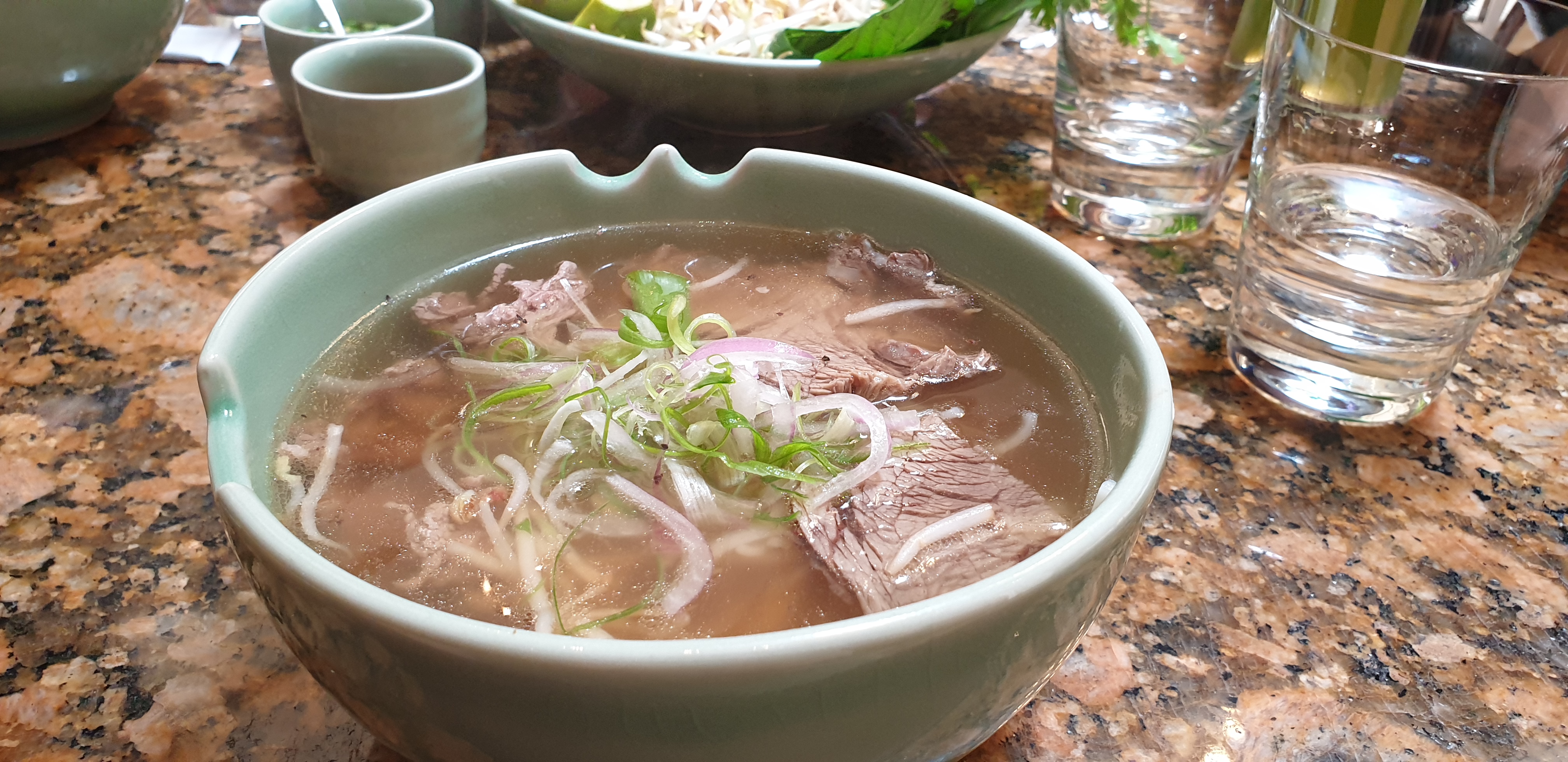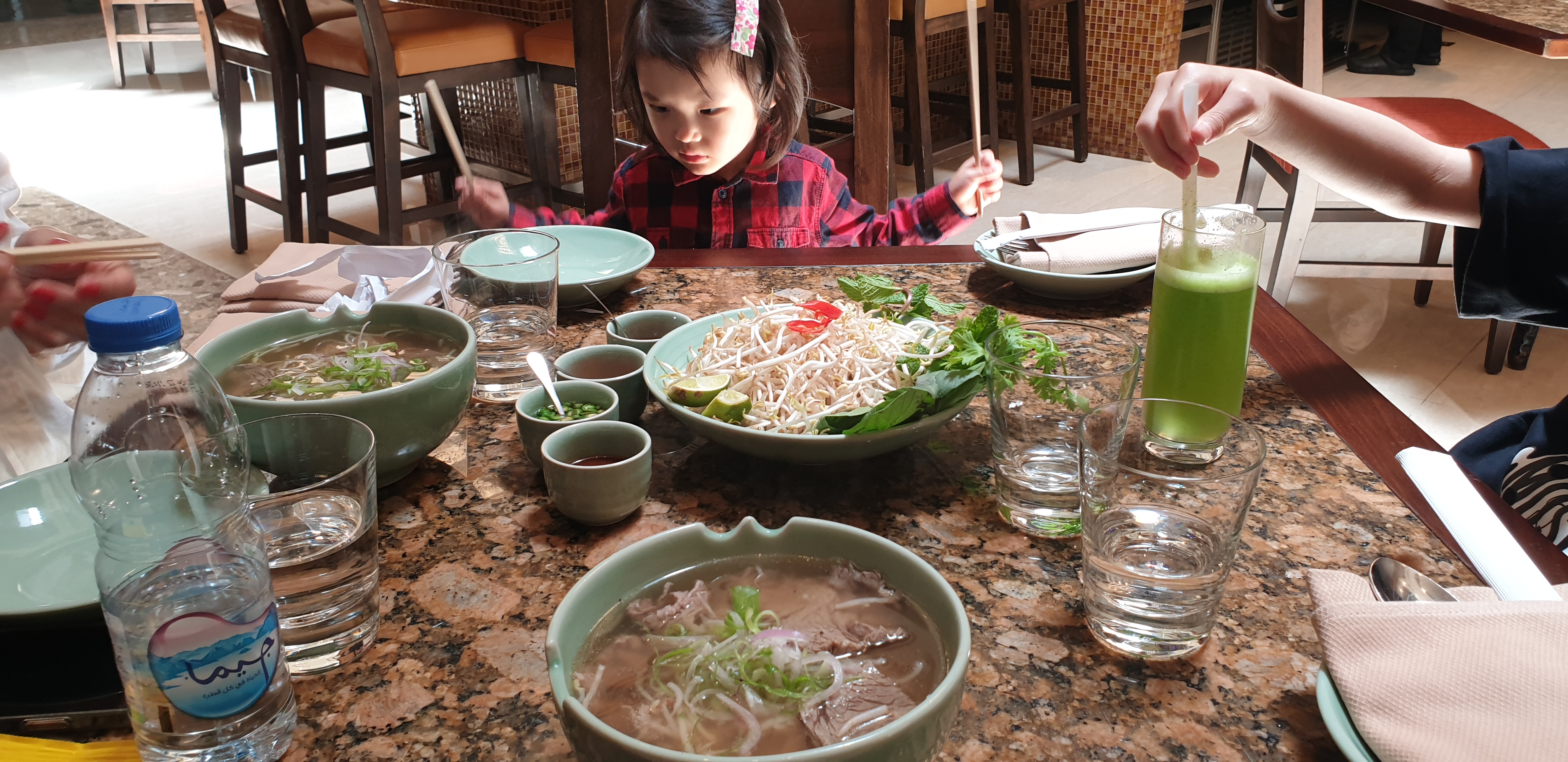 거의 오픈하자마다 방문을 해서 손님은 우리 가족 외에 한 팀 밖에 없었습니다. 메뉴판은 아주 간단하게 2장으로 구성되어 있습니다: 음식 메뉴 그리고 음료수 메뉴입니다. 메뉴판 Soups 아래 보이는 Vietnamese Beef Rice Noodle Soup (Pho)가 바로 우리 가족이 좋아하는 쌀국수입니다. 가격은 60 디르함이네요. 오늘 환율로는 약 2.1만원입니다. 최근에 환율이 많이 오르다 보니 원화 가격으로는 조금 올랐습니다.