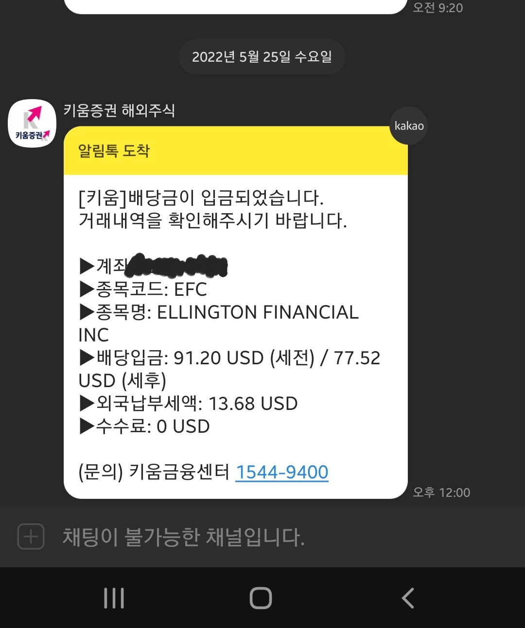 5월 25일 오늘도 엘링턴 파이낸셜에서 월 배당금이 입금되었다. 세후 $77.52