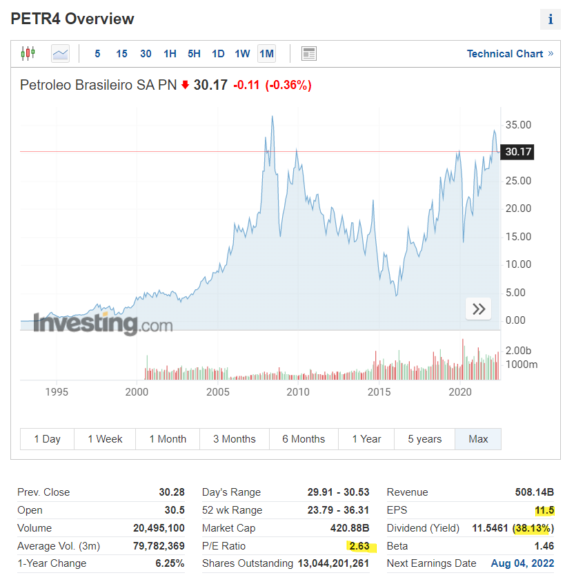 이번에 페트로브라스 우선주를 (미국: PBRa / 브라질: PETR4) 신규 매입하게 된 이유는 우선 기업의 압도적으로 높은 이익 창출력과 배당률 그리고 그에 비해 매우 저평가되어 있는 주가 때문이다. 물론 저평가되어 있는 나름의 이유가 있지만 그건 나중에 살펴보기로 하고 2022년 6월 6일 현재 기준 PER는 3이 안 되고 배당률은 34.18% 수준으로 Petrobras와 같은 규모의 기업에서는 사례를 찾아보기 힘들 정도의 수치다. 말 그대로 현재 배당금 규모가 앞으로도 유지된다고 하면 3년 안에 모든 투자금을 배당금으로 모두 회수 가능하다.