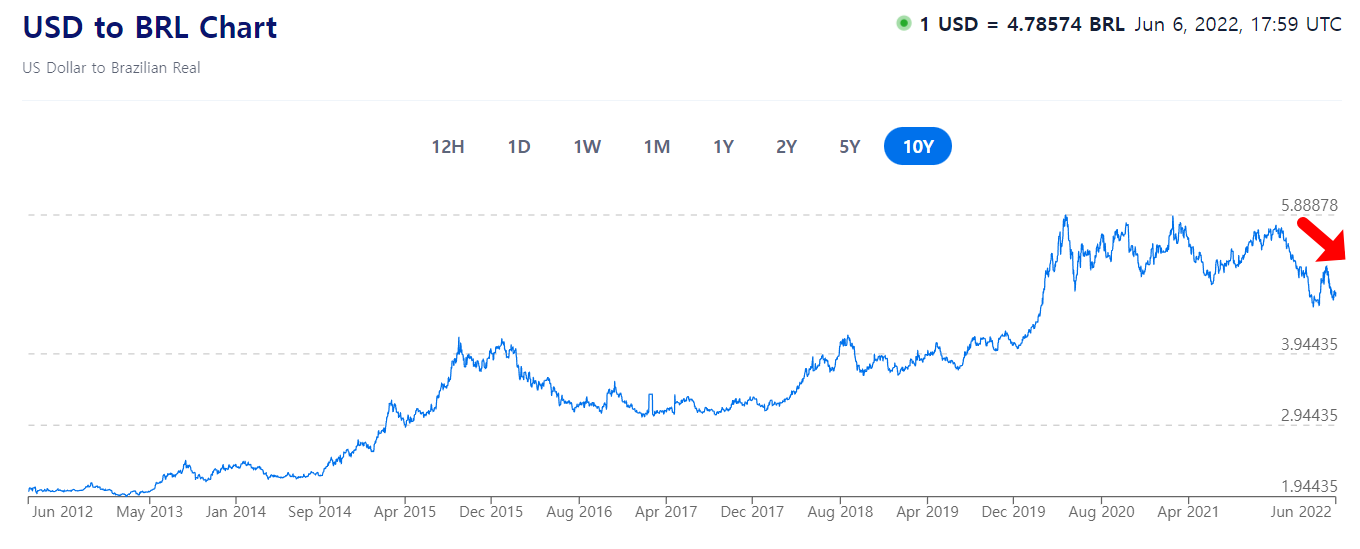 위 두 차트의 차이에서 볼 수 있듯이 브라질 헤알의 가치는 지난 10년 동안 상당히 떨어졌다. 2012년 $1 = 1.94 헤알 수준이었던 환율은 현재 $1=4.78 수준으로 브라질 헤알의 가치는 지난 10년 동안 2배 이상의 가치 하락을 겪었다.