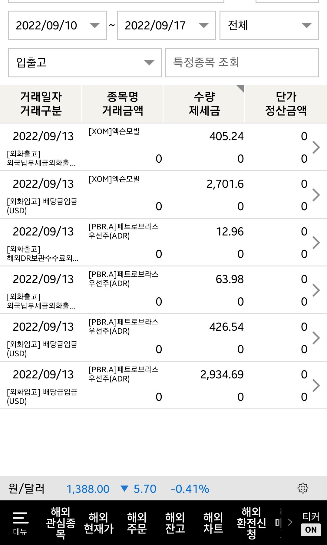 이번 주에 입금된 엑슨모빌 및 페트로브라스 배당금은 아래와 같다. 페트로브라스의 경우 배당을 두 번에 나눠 지급하는데 (9월 말 한 번 더 같은 배당금 입금 예정) 이번에 입금된 배당금조차도 2개로 나뉘어져 있고 그중에 하나는 15% 배당소득세를 미국에서 떼고 다른 하나는 국내에서 원화로 떼는 등 뭔가 복잡하다. 간단하게는 전체 배당금에서 약 15% 세금을 떼는 것과 비슷하다.