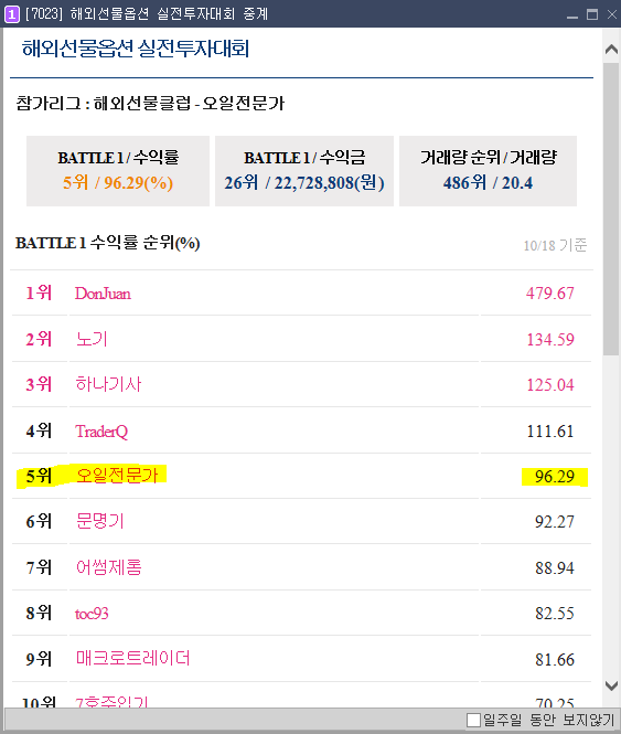 S&P500 지수나 Crude Oil에 큰 변동성이 생겨서 또 기회가 포착되면 모를까 이번 매매는 이것으로 종결했으니 나의 수익률도 96.29% 로 종결. 다른 참가자들에게 손실이 발생하면 내가 1위로 올라갈 수도 있지 않을까 하는 희망 회로를 돌려본다.