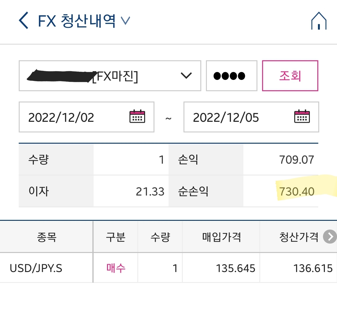 그리고 12월 5일 청산... 이틀 동안 FX이자 총 $21.33, FX마진 차익 $709.07, 총 수익 $730.40으로 거래 청산 완료.