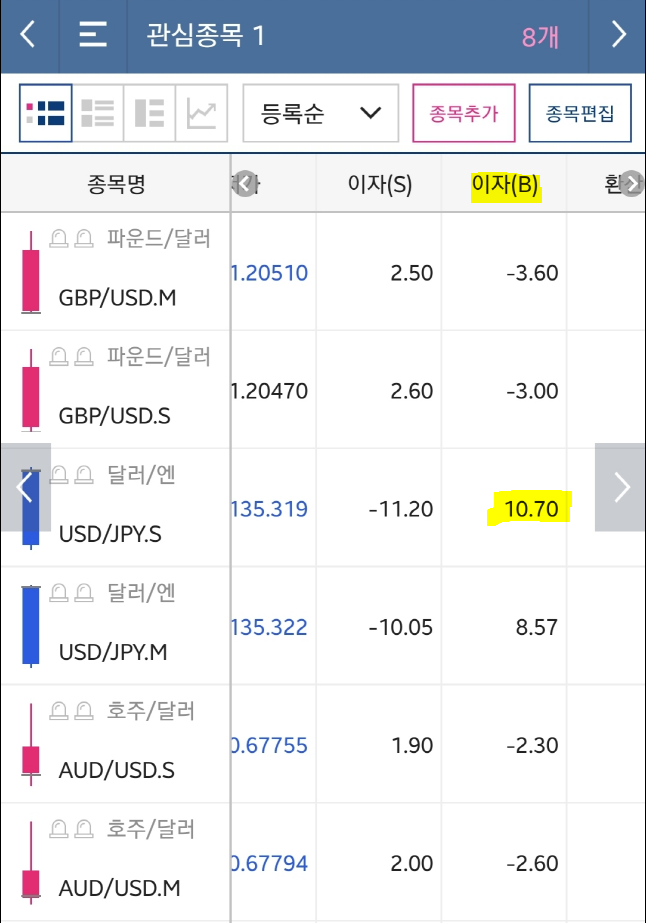 일본은 지금도 제로 금리를 유지 중이지만 미국은 기준 금리를 급격히 올리고 있는 중이다. 이 두 나라의 큰 기준 금리 차이 때문에 FX마진 포지션에 진입을 하면 매일 이자를 내야 하거나 이자를 지급받을 수 있는 상황이 발생한다. 나의 경우 이자가 거의 없는 JPY를 빌려 금리가 높은 USD를 샀기 때문에 매일 이자를 지급받을 수 있다.