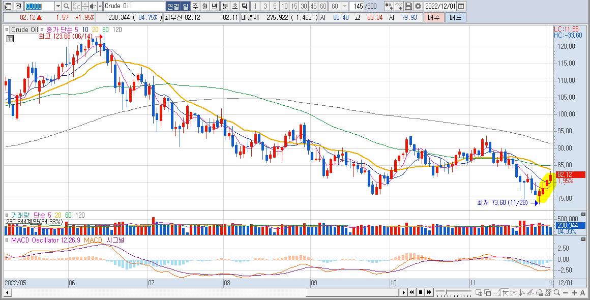 최근에 원유 선물 가격이 배럴당 $80 이하로 떨어졌었다. 이를 기회 삼아 원유 선물 매수 포지션을 소량 잡았고 오늘 이익으로 청산을 했다.