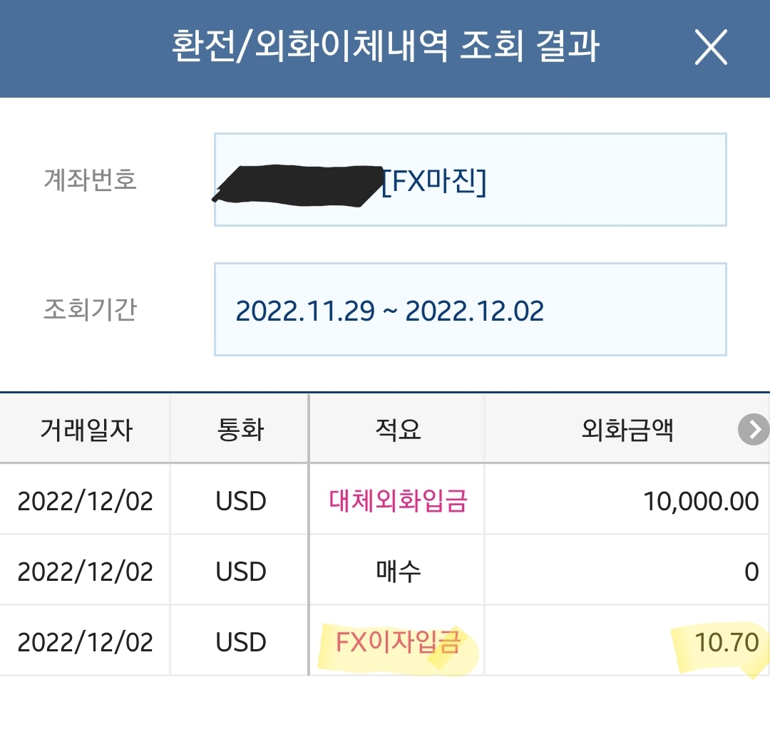 물론 원금이 보장되는 정기예금 상품과 비교는 무리지만 이자율만 비교하면 엄청난 차이다. FX마진에서 지급되는 이자는 해당 연도의 다른 배당/이자 금액과 합산되어 다음 해 5월 국세청 홈페이지에서 정산해야 한다. 합산한 금액이 연 2천만원 이하라면 비과세다 종합소득세 대상은 아니나 연 2천만원 이상이라면 다음년도 5월에 다른 소득과 합산하여 종합소득세를 납부해야 한다 (최근에는 법이 바뀌었을 수도 있으니 확인 필요).