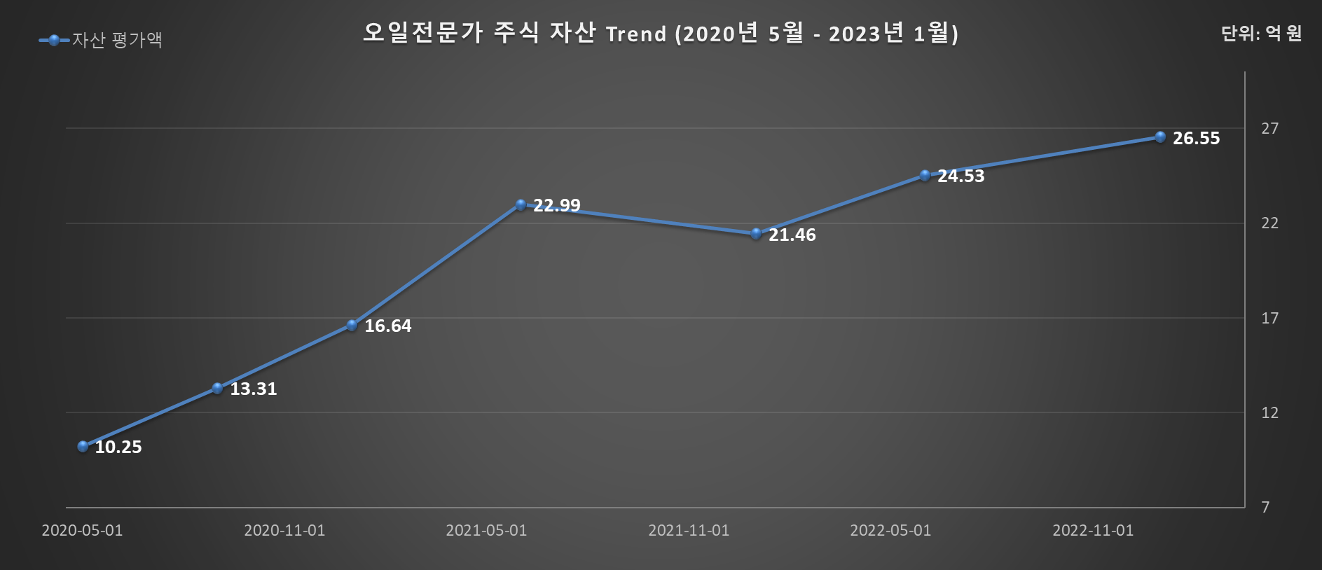 2020년 5월 30일 처음으로 공개했을 때 평가 금액은 약 10.25 억원. 사실 차트에는 안 나와 있지만 코로나 사태로 인해 주식 시장이 박살이 나던 2020년 3월에는 평가 금액이 6억원까지도 하락했으나 당시 주식을 팔지 않고 오히려 거꾸로 주식담보대출을 활용해 폭락한 우량주를 더 사모은 것이 나중에 핵심적인 역할을 했다.