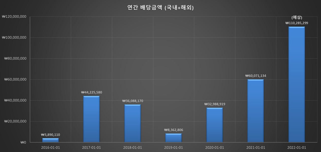 나의 투자 성향이 워낙 저평가 우량주/배당주를 사모은 후 Buy & Hold이다 보니 2022년 올해 예상되는 배당금은 국내 및 미국 주식을 합쳐 세후 약 1.1 억원이 되었다. 국내 배당소득세율 15.4% 그리고
