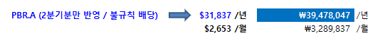 해외 주식의 경우 엑슨모빌과 같이 매우 안정적으로 예측 가능한 배당을 지급하는 기업이 있기도 하지만 페트로브라스처럼 매우 불규칙하게 그리고 예측이 어려운 배당을 지급하는 기업도 있기에 나름대로의 기준으로 판단한 예상 배당 소득은 약 3,947 만원이다. (세후)