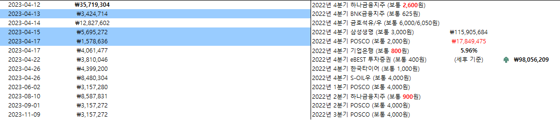 좀 더 세부적으로 들어가 내가 예상하는 기업별 배당금은 아래와 같다. 하늘색으로 표기된 BNK금융지주, 삼성생명 그리고 POSCO는 이미 확정된 배당금이다. 국내 기업에서 예상하는 배당 소득은 약 9,805 만원이다 (세후).