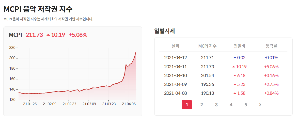 주식 시장에는 KOSPI 지수가 있듯이 뮤직카우도 MCPI 음악 저작권 지수라는 것을 만들어 사이트에 매일 공개하고 있는데 아래 보는 것처럼 3월 말 이후부터는 지수 자체가 가파르게 상승 중이다. 뮤직카우가 갑자기 마케팅을 잘 해서인지 아니면 다른 이유가 있어서인지 확실치는 않지만 저작권 시장에 갑자기 자금이 몰려드는 듯한 느낌이다.