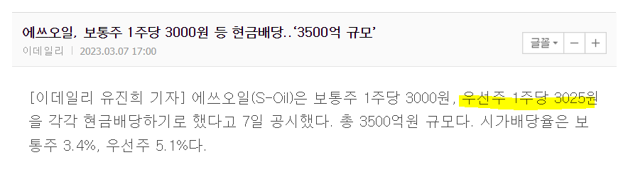 2023년 3월 7일 오늘 배당금이 공시되었다. 우선주는 주당 3,025원. 4월에 15.4% 배당소득세를 제하고 약 641 만원이 입금될 예정이다.