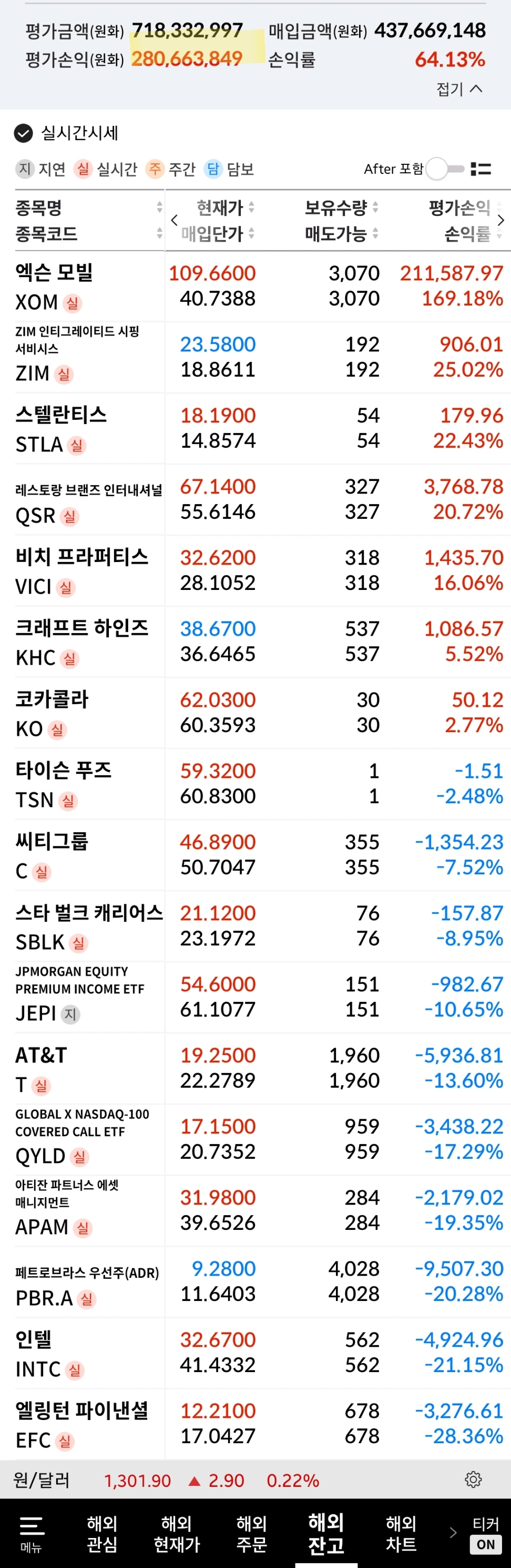 2023년 4월 1일 기준 현재 보유 중인 미국 및 해외 주식은 아래와 같다. 시험 삼아 매수한 Tyson Foods 1주 외에 신규로 매수한 종목은 없으며 입금된 배당금은 100% 기존 종목 주식 수를 늘리는 데에 활용했다. 해외 주식 자산 평가 금액은 총 7억 4,354 만원으로 지난 포스팅 대비 약 1,020 만원 증가했다. 지난 번 포스팅과 비교해보니 수익률은 오히려 조금 감소했는데 (원화 기준) 평가 금액이 늘어난 것은 환율이 약간 상승한 것과 입금된 배당금으로 계속 주식을 사모았기에 그런 것으로 판단된다.