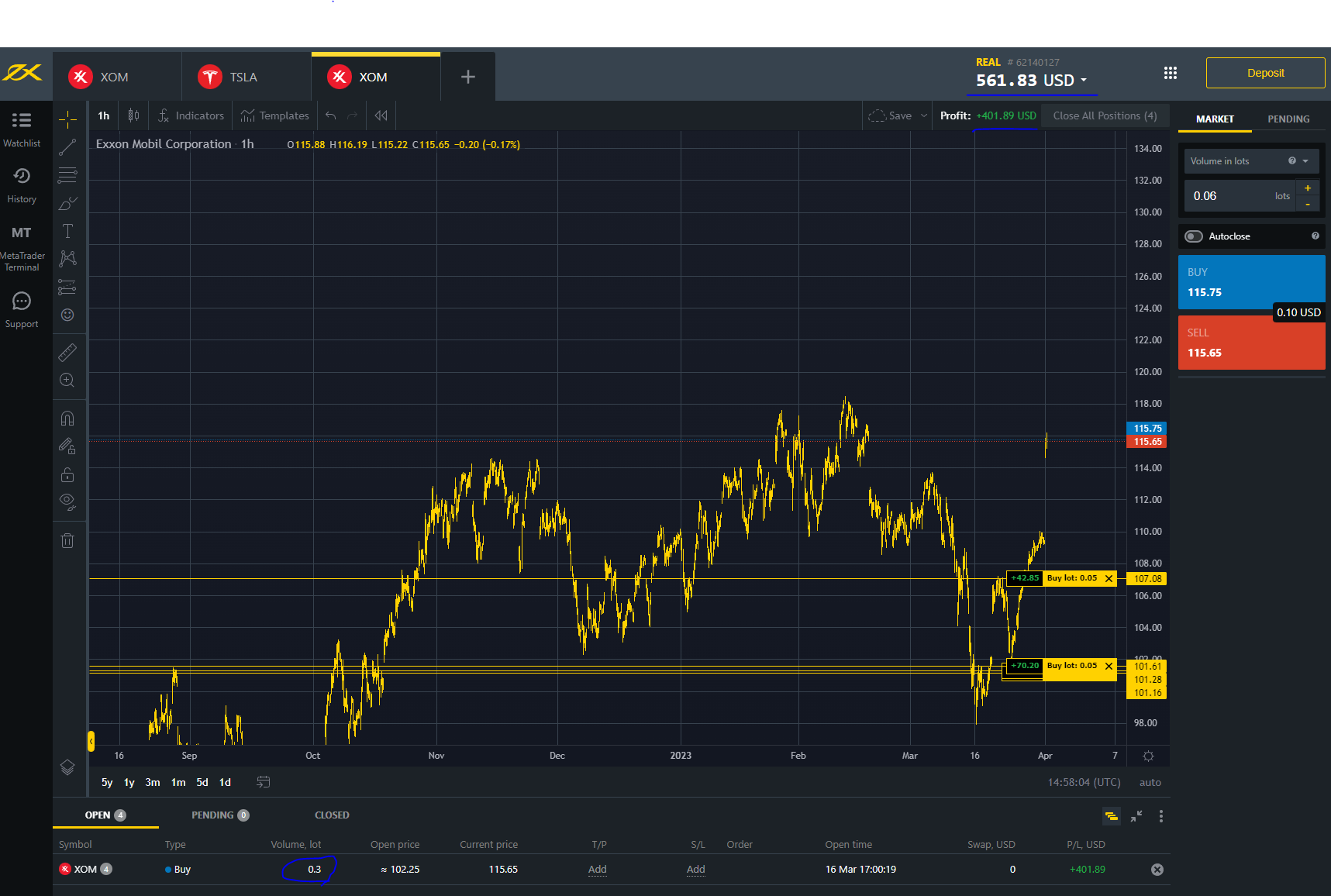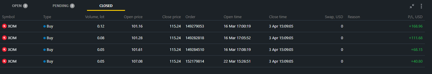 3월 중순에 엑슨모빌 주가가 $100 초반까지 하락했었다. 마침 Exness 계좌에 약 $150 정도의 잔돈이(?) 있었는데 재미 삼아 오랜만에 엑슨모빌 0.3 Lot (30 주) 정도의 분할 매수 포지션을 잡았다.