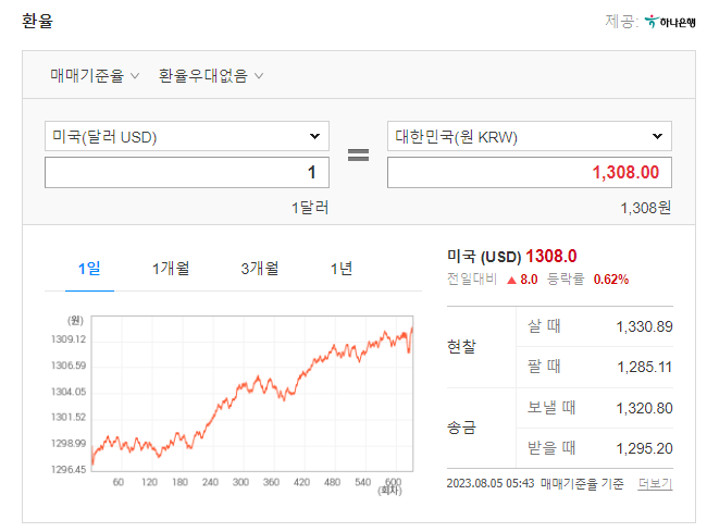 환율은 지난 2개월 동안 아래로 내려가는 듯하다가 다시 금세 상승하면서 다시 1,300원을 넘었다. 8월 5일 현재 기준 환율은 달러 당 1,308원. 2개월 전에 1,310원이었으니 결과적으로 거의 변동이 없다.