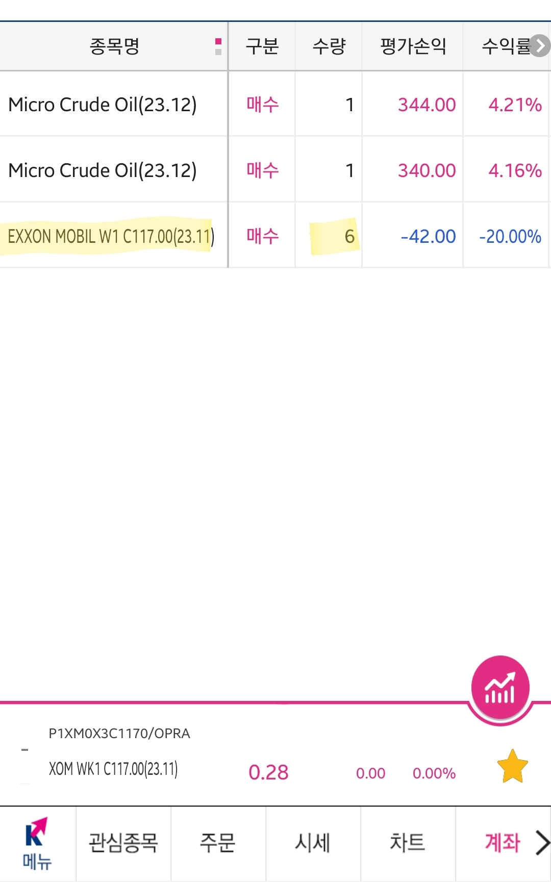 그래서 내가 매수한 엑슨모빌 콜옵션은 아래와 같다. 만기일은 11월 첫째주이고 행사가격은 $117이다. 내가 지불한 프리미엄 가격은 주당 $0.35. 콜옵션 6 계약을 매수했다. 콜옵션 1 계약은 100주에 해당된다. 엑슨모빌 현재가가 $107이니 11월 첫째 주까지 $117을 넘지 못하면 내가 지불한 6 계약에 해당하는 증거금 $210은 그냥 날린 셈이 된다. ($0.35 X 100 X 6 = $210)