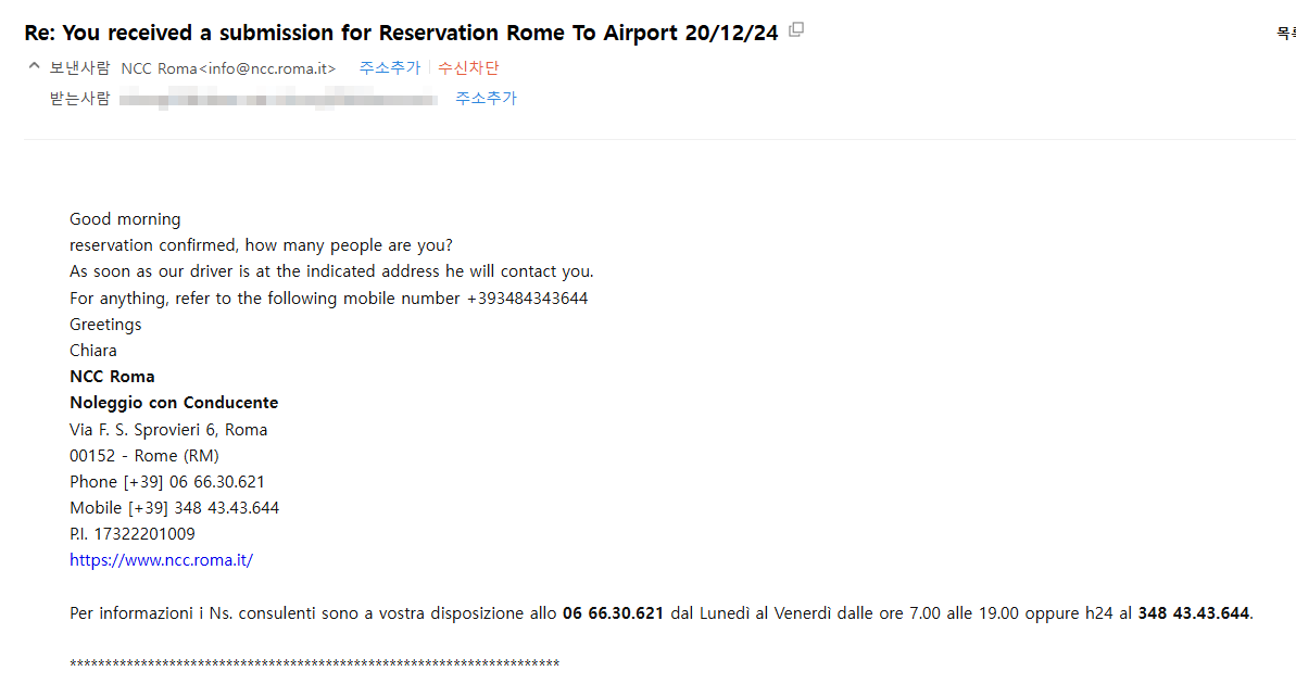 8일간의 로마 여행을 마치고 다시 공항으로 돌아가야 하는데 또 짐을 끌고 큰 길까지 나가서 짐을 싣고 하는 과정이 너무 귀찮았다. 그래서 검색을 조금 해보니 더 저렴한 가격에 더 큰 차량(벤츠 VITO 밴)으로 공항까지 이동이 가능했다.