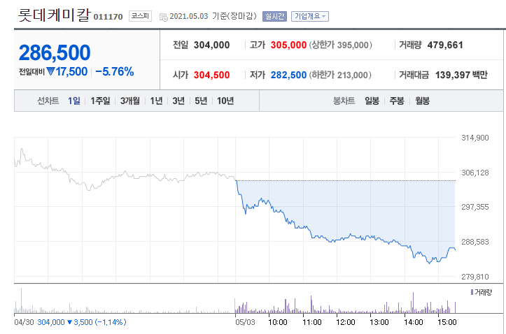 2021년 5월 3일 공매도가 재개되는 날. 공매도가 재개되더라도 설마 롯데케미칼 같은 기업의 주가가 하락할까 싶었지만 역시나 나의 생각과는 달리 5% 이상 하락했다.