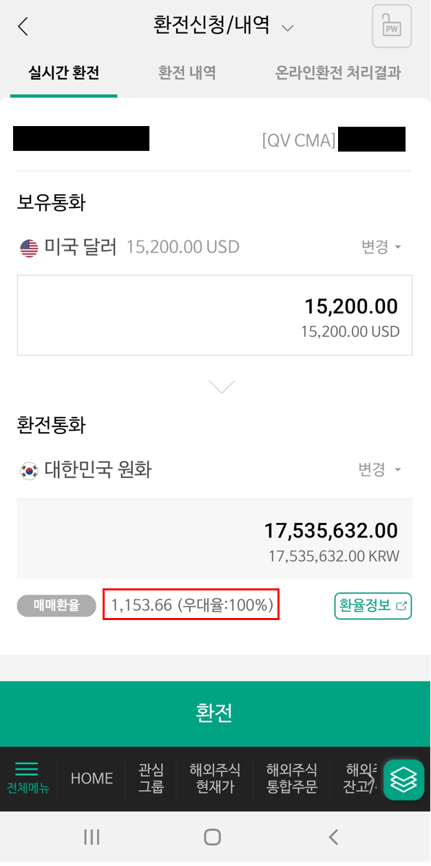 달러는 실시간으로 송금이 됐고 NH투자증권 계좌로 받자마자 달러를 원화로 바로 환전을 했다. 아래 사진을 보면 우대율 100%가 적혀 있는 것을 볼 수 있다.