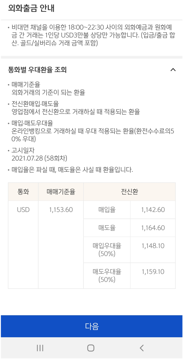 은행마다 개인마다 적용되는 환전 우대율은 다르겠으나 나의 경우 신한은행을 사용하는데 아래 나와있는 것처럼 환전 우대율은 50%이다. 7월 28일 기준 달러 매입 환율은 1,142.60원/달러이나 50% 우대율은 적용하면 환율은 1,148.10원/달러로 조금 나아진다.