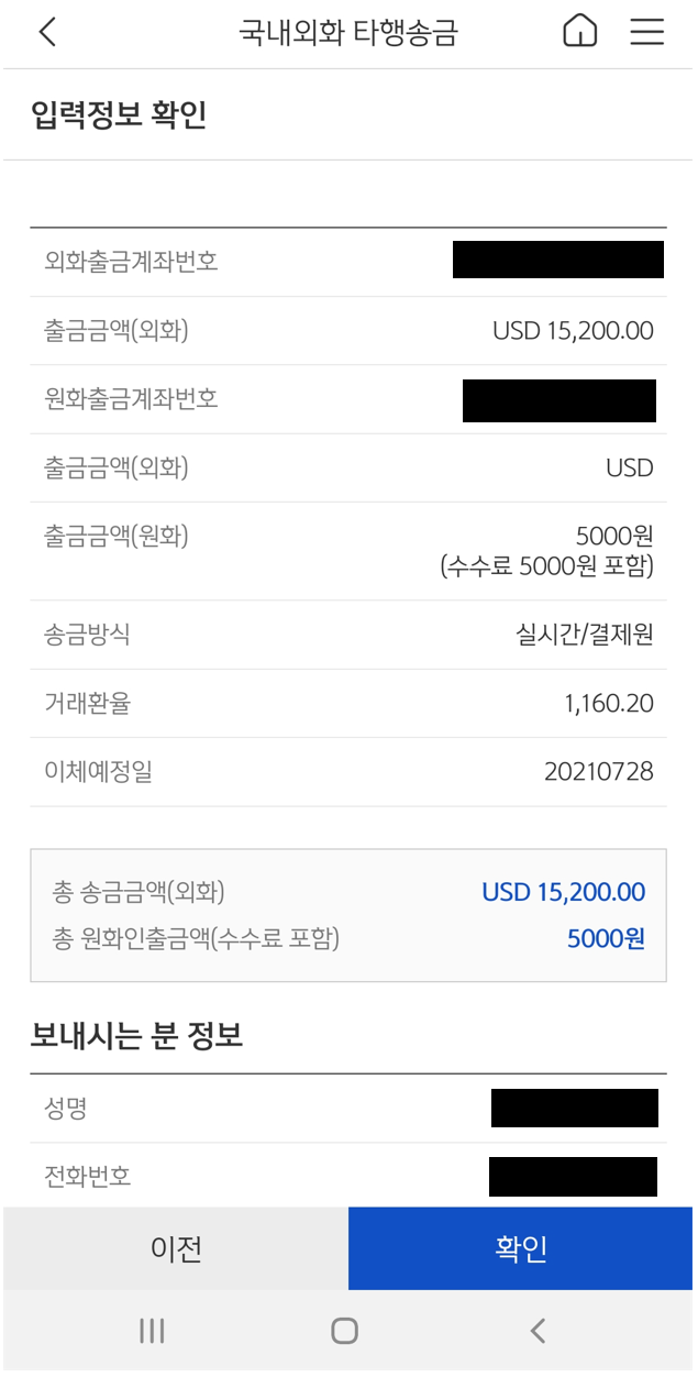 회사 동료를 통해 알게된 사실은 증권사에서 제시하는 환전 우대율은 은행보다 높다는 것이고 이 중 NH투자증권의 경우 환전 우대율이 100%로 사실상 매매기준환율 그대로 환전이 가능하다는 것이다. 그래서 오늘 신한은행 외화계좌에 있는 $15,200을 NH투자증권으로 송금을 했고 국내 외화이체 수수료로 5,000원을 냈다.