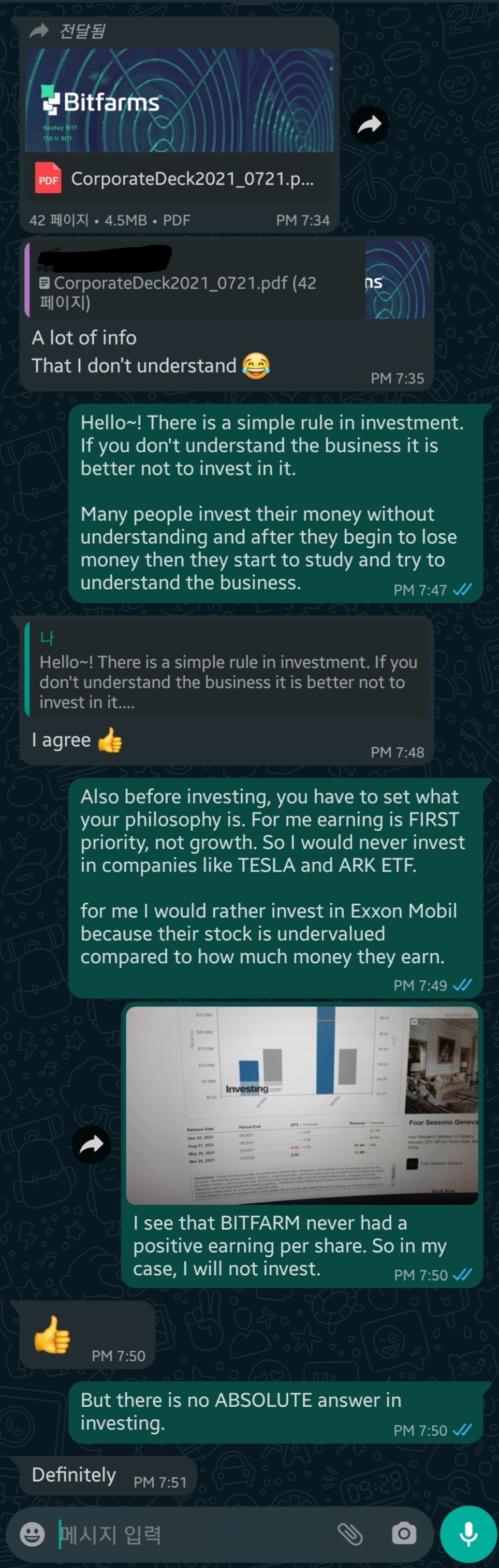 그러더니 오늘은 Bitfarm 기업 관련 정보가 있는 PDF를 나에게 보내더니 자기는 봐도 잘 모르겠다면서 연락이 또 왔다. 그래서 뻔하지만 정답에 가까운 간단한 조언을 해주었지만 이 동료가 정말 이해를 했는지는 모르겠다.
