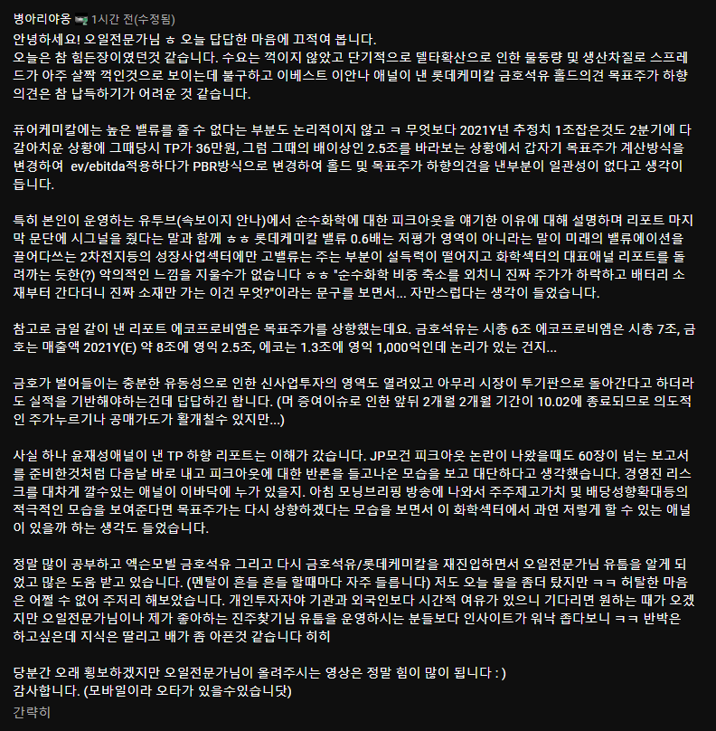 2021년 8월 9일, 오늘 금호석유 목표가를 하향한 증권사 리포트가 여럿 나오면서 금호석유는 꽤 하락했다. 아마 금호석유를 보유한 많은 투자자분들은 오늘이 꽤 답답한 하루였을 것이다. 그래서 그런지 오늘 유튜브 구독자 한 분께서 장문의 댓글을 달아주셨다.