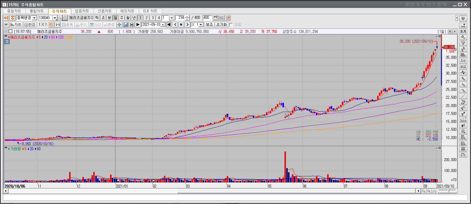 다행히 얼마 안 지나 자사주 매입을 시작했다. 1차 매입이 끝나니 2차 매입이 시작했고 2차 매입이 끝나니 3차 매입을 시작했다. 2차 자사주 매입 때까지만 해도 점진적으로 상승하던 주가는 3차 자사주 매입 공시와 함께 갑자기 폭발적인 상승을 하기 시작했다. 3차 자사주 매입으로 많은 사람들이 메리츠금융지주의 주주가치 제고 방안이 허언(?)이 아님을 깨달아서 그런지 연속 15일 상승 중에 있다.