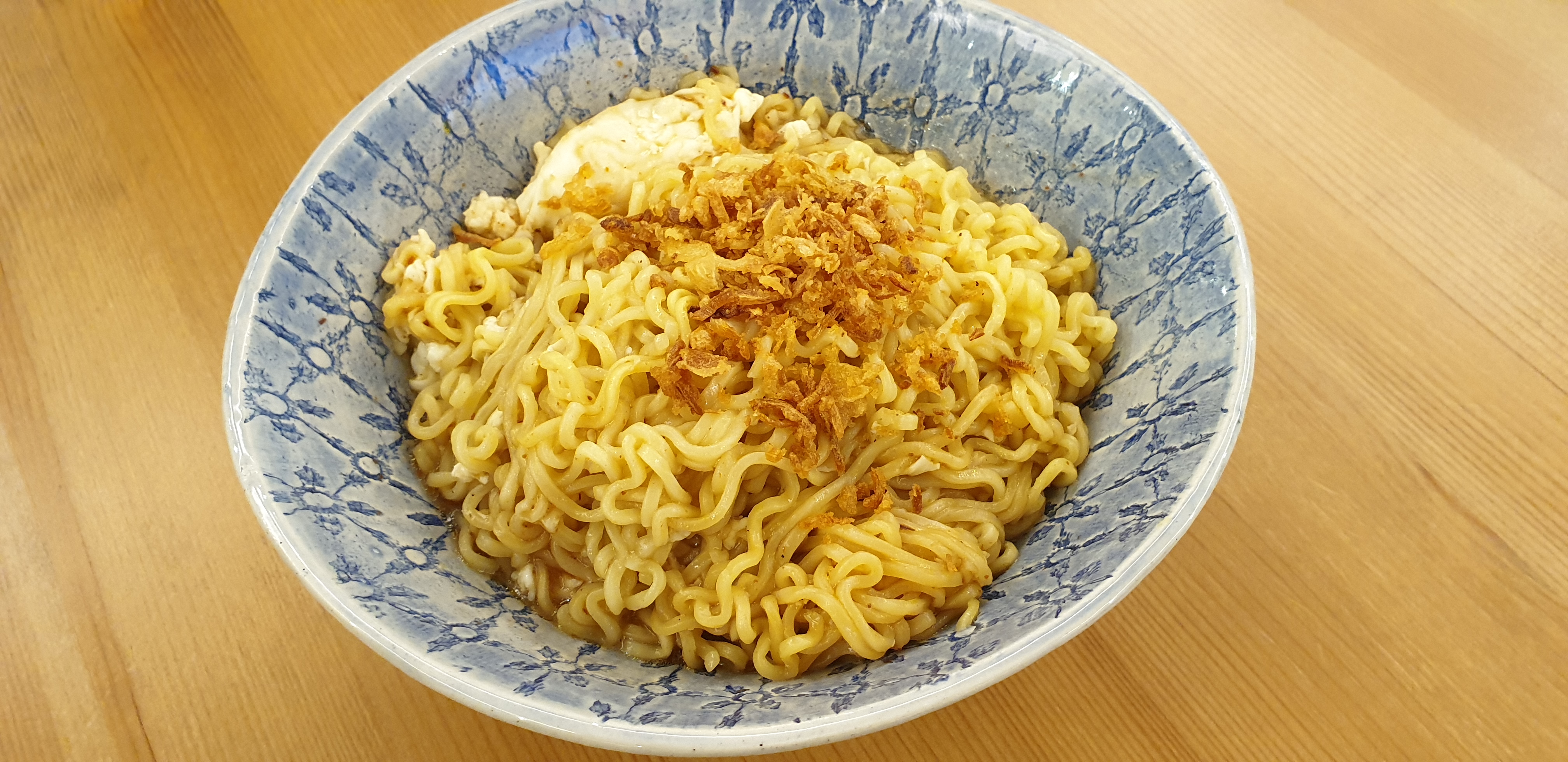 사진을 미처 못 찍었는데 라면에 거의 다 익혀질 무렵 계란을 하나 넣어 반숙한다. 그리고 물을 모두 버린 후 면과 그릇에 미리 준비한 각종 양념 비빔을 잘 섞은 후 위에 튀긴 양파 부스러기를 뿌려주면 끝.