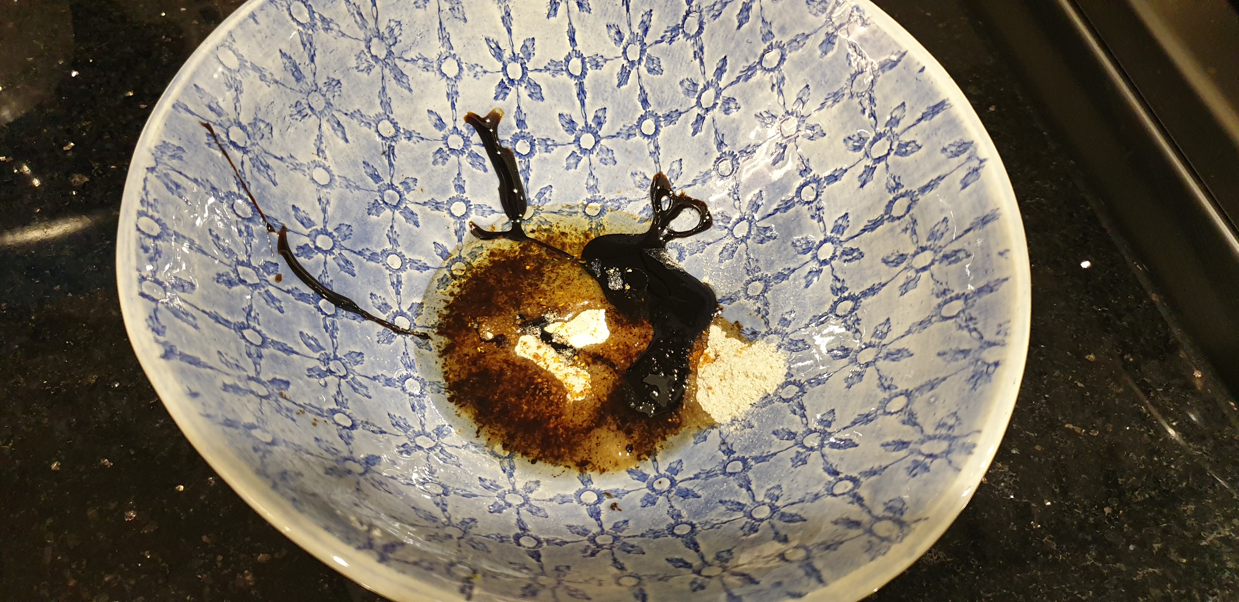 옆에서 끓고 있는 라면에서 끓는 물 세 스푼 정도를 그릇에 넣고 적절히 섞어 녹여준다.