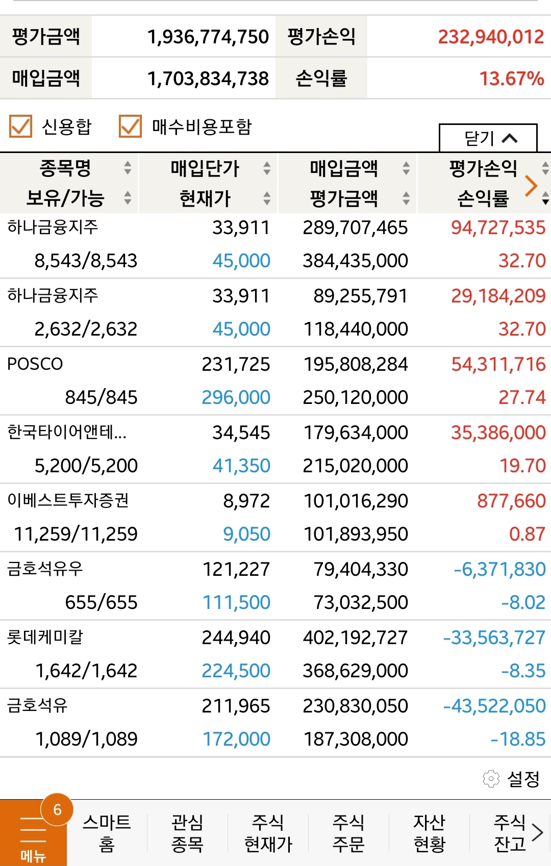 국내 주식 자산 평가 금액은 최고 약 22억원도 도달했으나 현재는 약 3억원이 줄어든 19억원을 보이고 있고 매주 감소 추세에 있다.