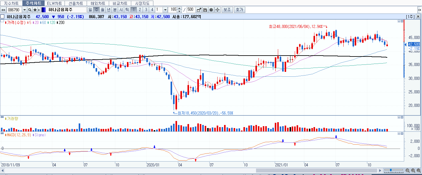 기준금리가 어제 0.25% 상승되어 이제 1%가 되었다. 안 그래도 사상 최고 실적을 계속 경신중인 금융기업들은 금리 상승으로 더 큰 실적 상승이 예견되고 있다. 금리 상승은 내년에도 계속 이어질 것으로 예상되는 바, 실적 상승 역시 계속 당분간 이어질 것으로 보고 있다. 하나금융지주는 지난 6월 최고점 대비 현재 약 13% 정도 하락했다. 그나마 상대적으로 작은 하락이다.