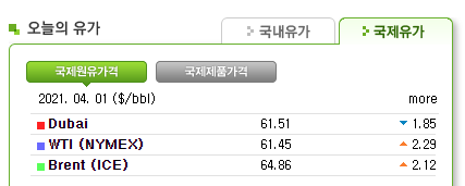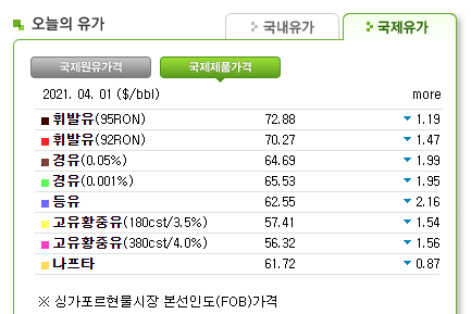 우리나라의 경우 도입하는 원유 대부분이 중동산이므로 원유 가격은 그냥 두바이유를 사용한다. 우리나라 정유사의 경우 정제품 가격은 싱가포르 현물 시장 가격을 기준으로 함으로 한국석유공사 홈페이지에 나와있는 정제품 가격의 평균을 사용한다.