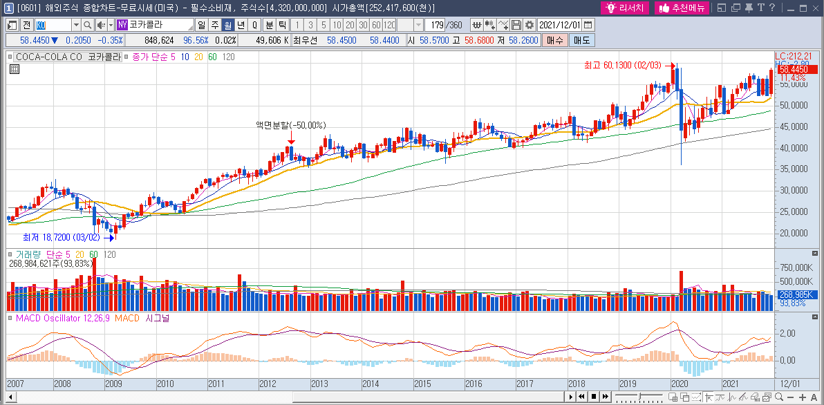 사람들이 관심을 갖지 않는 주식을 왜 워런 버핏은 여전히 들고 있을까? 이유는 바로 워런 버핏의 코카콜라 평단가 그리고 배당에 있다. 워런 버핏은 코카콜라 주식을 꾸준히 매입했는데 특히 1988년 - 1989년 사이에 집중 매입을 했고 이 때 평단가는 무려 $3.25다. 2021년 12월 17일 (장중) 현재가는 약 $58.50 이니까 수익률은 1,800%. 놀라운 수익률이긴 하지만 만 30년 이상의 투자 기간을 고려했을 때 엄청나게 높은 수익률은 아니다.