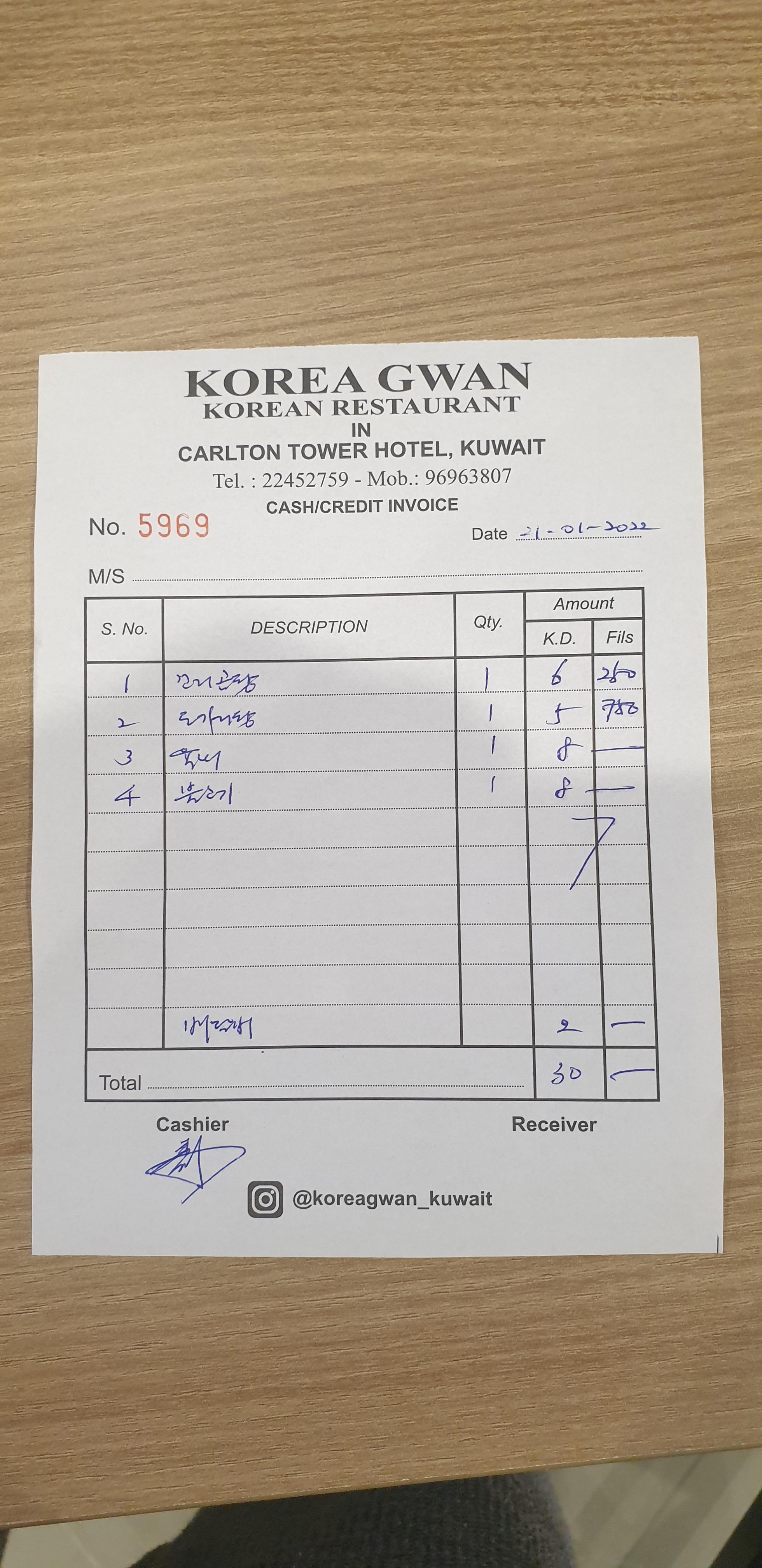 우리 가족 4명이 (어른 2, 아이 2) 먹기에는 양이 좀 많은 편이었고 그래서 남은 음식은 저녁거리로 처리했다. 배달 주문한 음식 금액은 총 30 KD (배달료 2KD 포함). 2022년 1/22일 매매기준율 기준으로는 원화 약 11.8만원이다. 비싸게 느껴질 수도 있는 금액이지만 해외에 있는 한식당 치고 싼 곳은 거의 없다.