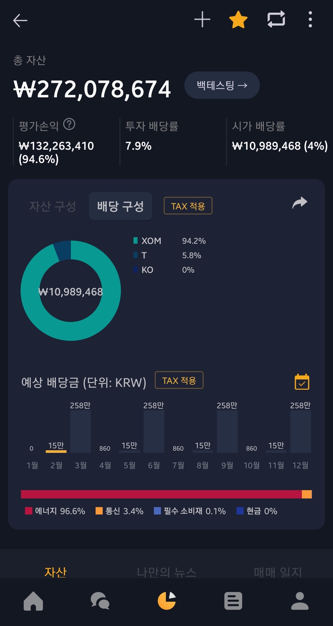 엑슨모빌(XOM) 비율이 높다보니 배당금은 3, 6, 9, 12월에 집중되어 있다. 다른 종목 비율도 조금씩 높이면 안정적인 미국 달러 월 배당금도 가능해지리라고 생각한다.