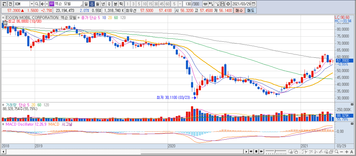 사실 2020년 10월까지만 해도 난 미국 주식을 거들떠 보지도 않았다. 미국 주식 시장 PER 자체가 한국 KOSPI보다 높게 형성되어 있으니 미국 개별 주식 종목에 그닥 관심이 가지 않았다. 하지만 어느날 우연치 않게 엑슨 모빌의 주가를 보니 내가 알던 $100 넘어가던 엑슨 모빌의 주가는 이제 $33 대에 가격이 형성되어 있어 당시 가파르게 상승하던 테슬라나 넷플릭스 같은 테크 주식과 대비되며 주가가 너무 저렴해보였다.