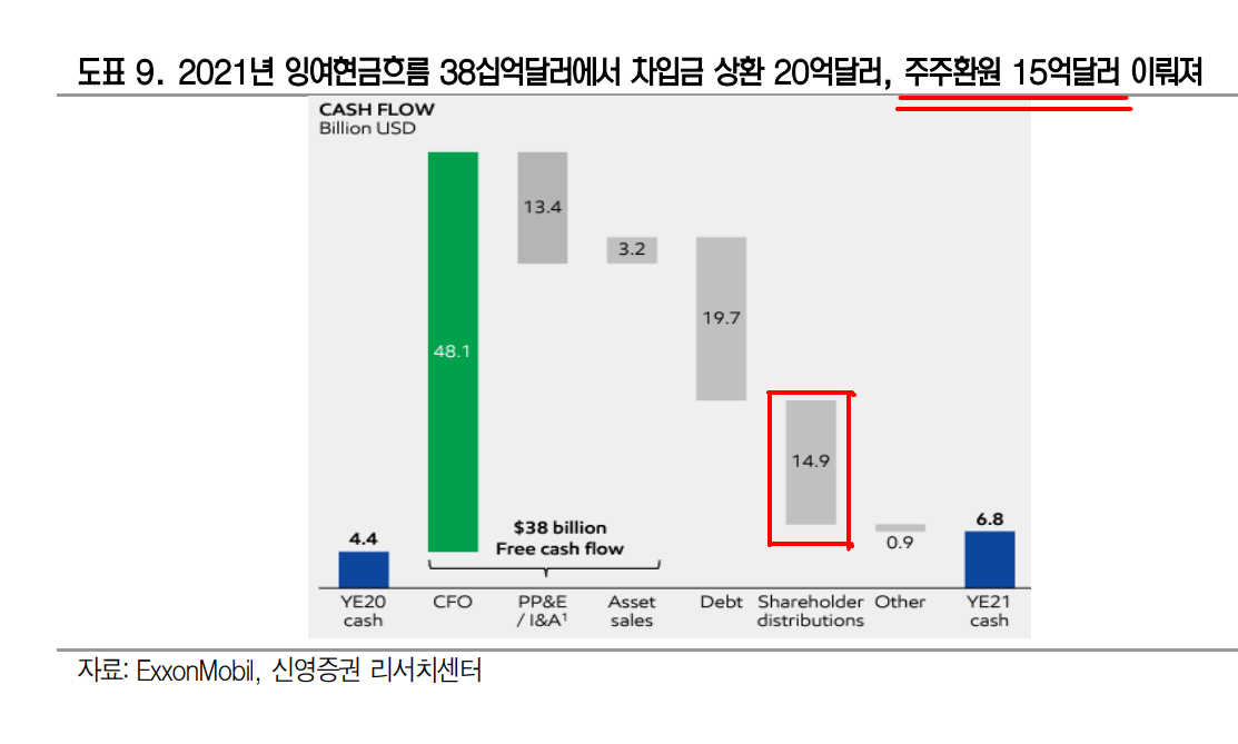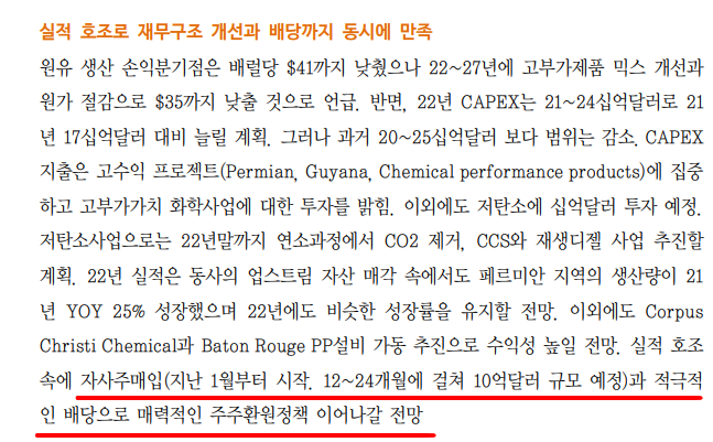 엑슨모빌은 지난달부터 자사주 매입을 재개했다. 약 10억 달러로 한국 원화로는 무려 1.2조 원에 달하는 금액을 자사주 매입에 활용한다고 한다. 2021년 작년 한 해 동안 실적이 좋았던 만큼 이 과실을 기업의 주인인 주주에게 환원하는 것을 당연시하는 엑슨모빌의 모습은 아쉽게도 국내 정유사에서는 찾아보기 어렵다.