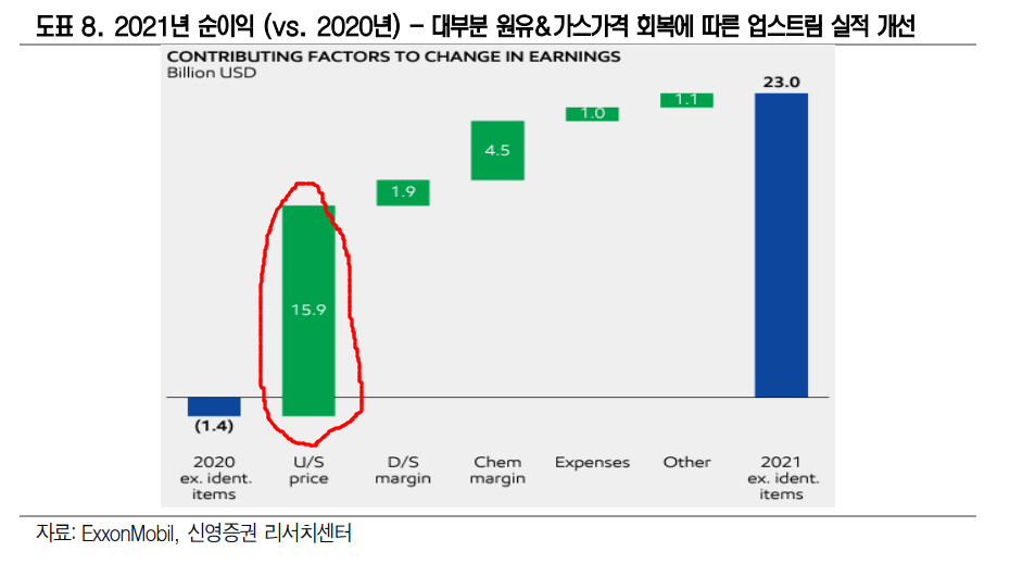 이번에 발표된 엑슨모빌의 2021년 4분기 사업별 순이익 비중을 보면 고유가가 전체 순이익에 얼마나 큰 비중을 차지하는지 볼 수 있다 (64% 차지). 참고로 다운스트림은 정유업 그리고 케미칼은 석유화학업이다.