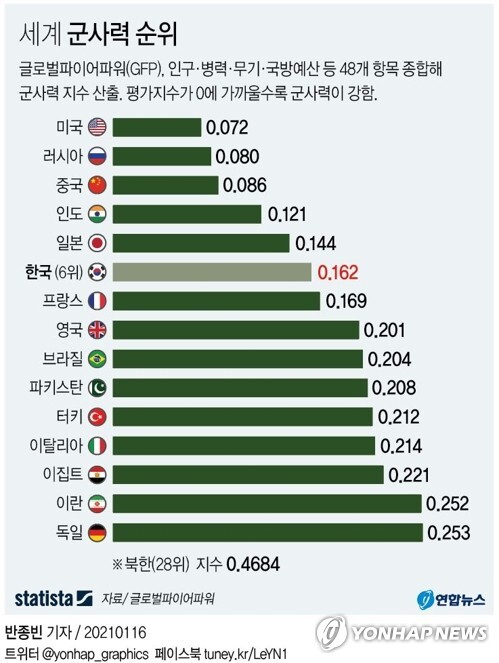 그러한 관점에서 우리나라는 매우 잘하고 있다. 현재 군사력은 세계 6위 수준이며 K9 자주포, K2 흑표 MBT (Main Battle Tank), 한국형 미사일 방공 시스템 천궁을 여러 나라에 이미 수출하거나 협의 중에 있고 세계적인 수준의 현무 시리즈 탄도 및 순항 미사일, 한국형 KFX 차세대 전투기 등을 지속적으로 개발하고 있으며 노무현 정부에서 비밀리에 추진했으나 무산된 한국형 핵추진 잠수함을 문재인 정부에서 재추진 의사를 지속적으로 암시해왔다.
