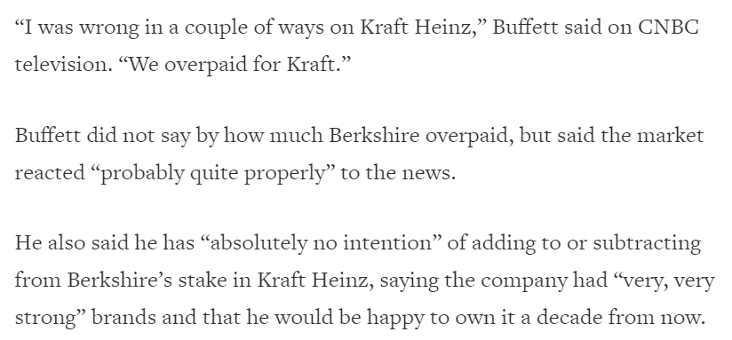 워렌 버핏도 크래프트 하인즈에 장기 투자 중이다. 매수한 가격에 비해 현재 주가는 거의 반토막이 되어 평가 손실이 있지만 크래프트 하인즈에 대한 확신에는 흔들림이 없는 듯하다.