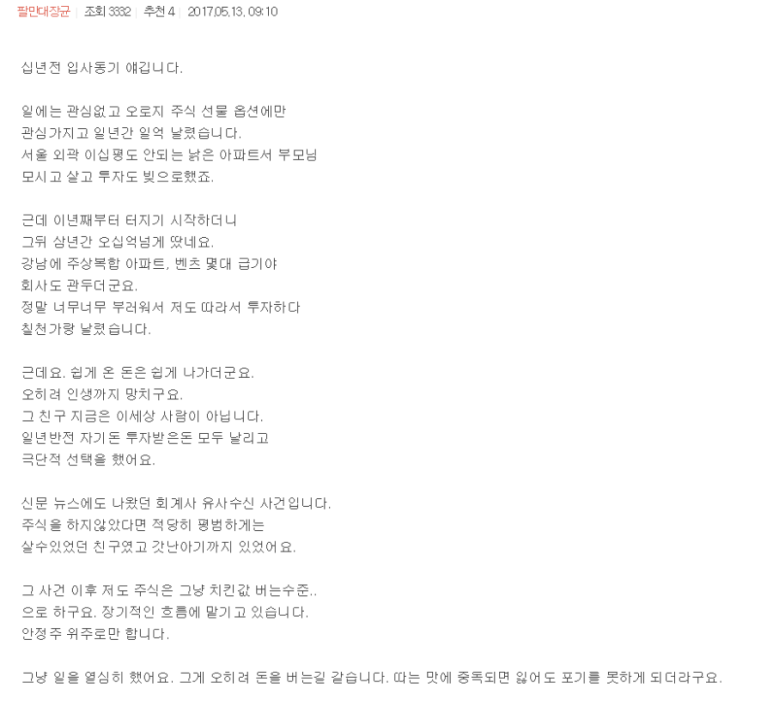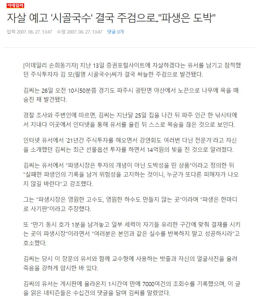 아래 실패 사례를 통해 배울 것은 없는지 한 번 살펴보자. 아래는 "시골국수" 필명으로 활동하던 파생 상품 트레이더의 유서다.