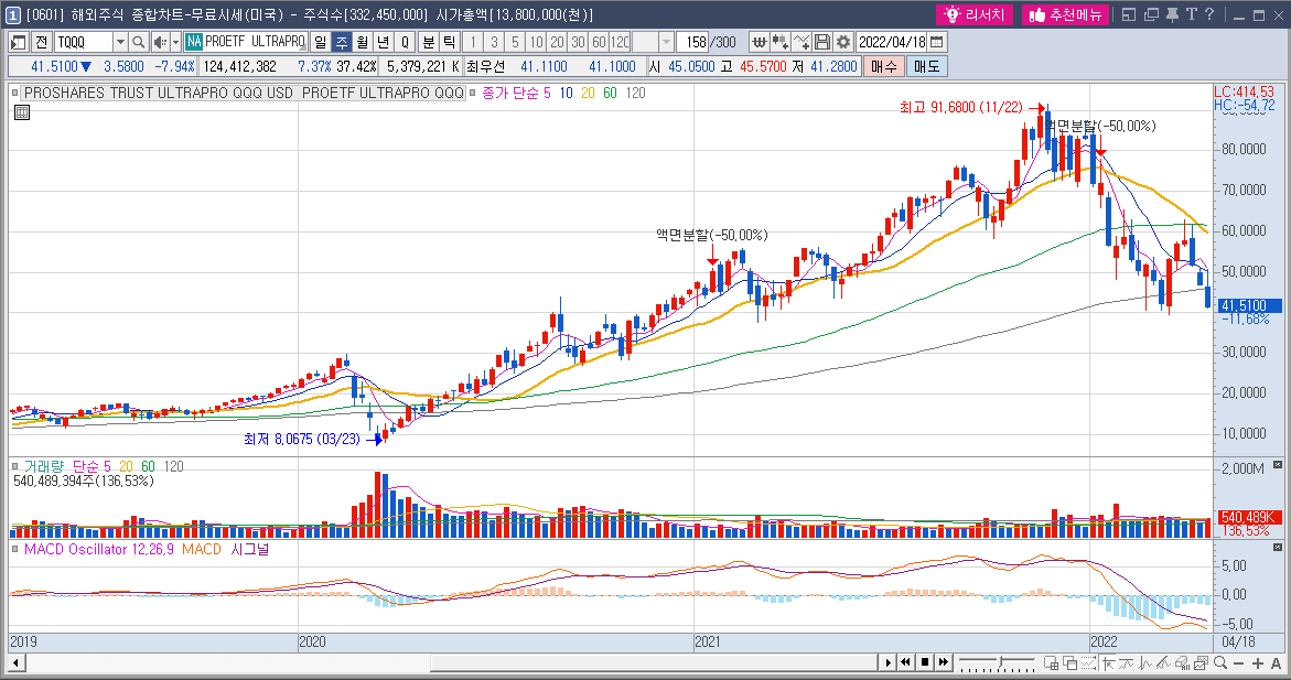 그 사이 한국인이 올해 두번째로 많이 산 TQQQ는 (TQQQ: 나스닥 지수 3배 추종 ETF) 어떻게 됐을까? 작년 11월 22일 최고가 $91.68 찍은 후 현재는 약 55% 하락한 $41.51 이다. 나스닥이 기적적으로 내일부터 당장 다시 최고점을 향해 상승 한다한들 이익은커녕 원금도 못 찾는다.