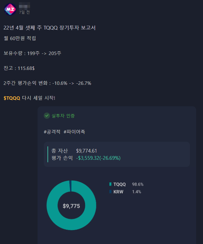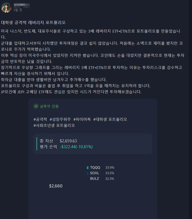 그럼에도 불구하고 역시 한국인의 급한 성격은 어쩔 수 없는 것인지 3배 추종 상품에 몰빵(?) 투자한 사례를 쉽게 찾아볼 수 있다.