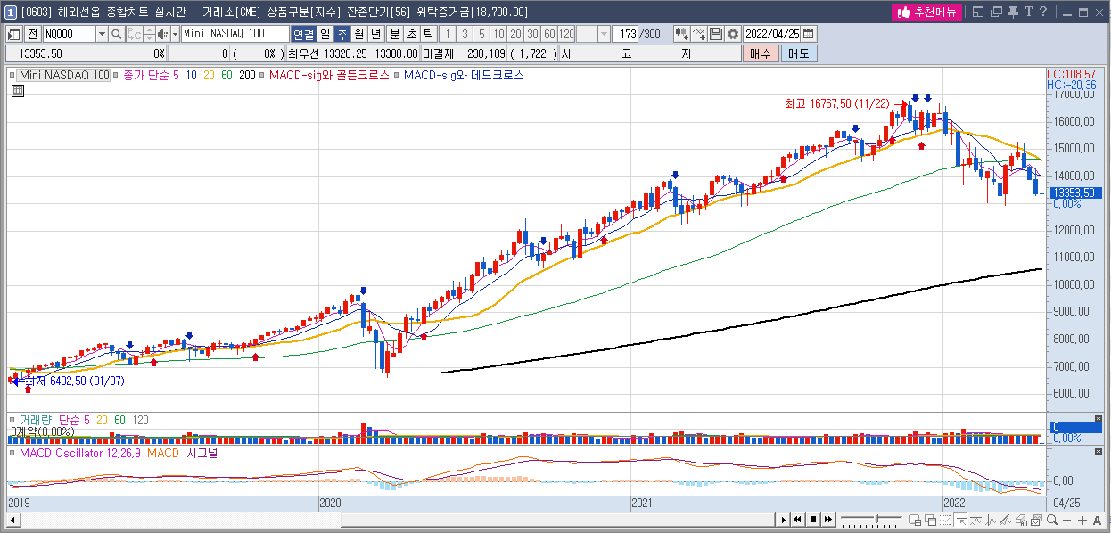 2022년 4월 22일 어제 미국 지수가 꽤 큰 폭으로 하락을 했다. 나스닥 지수의 경우 작년 11월 22일 최고점 16,767를 도달한 후 현재는 약 20% 하락한 13,353 이다.